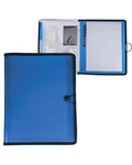 • Full-size organizer/folio with expandable folder pocket with hook and loop fastener, CD/DVD and business card slots on left side, writing pad on right side